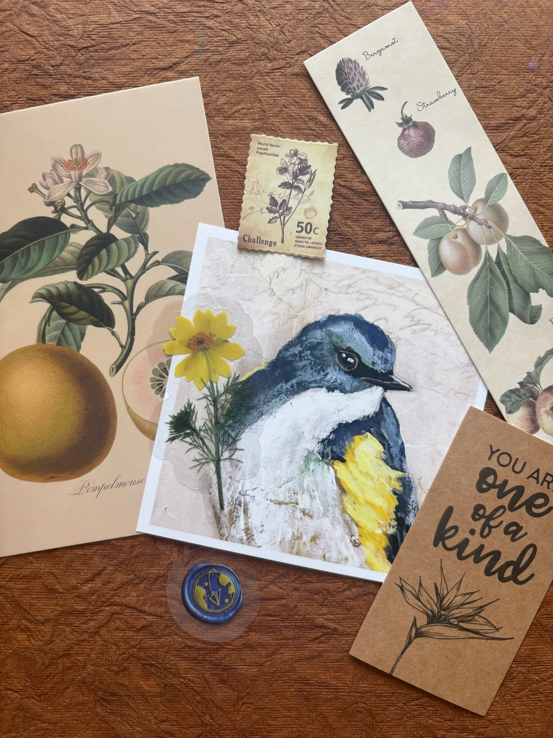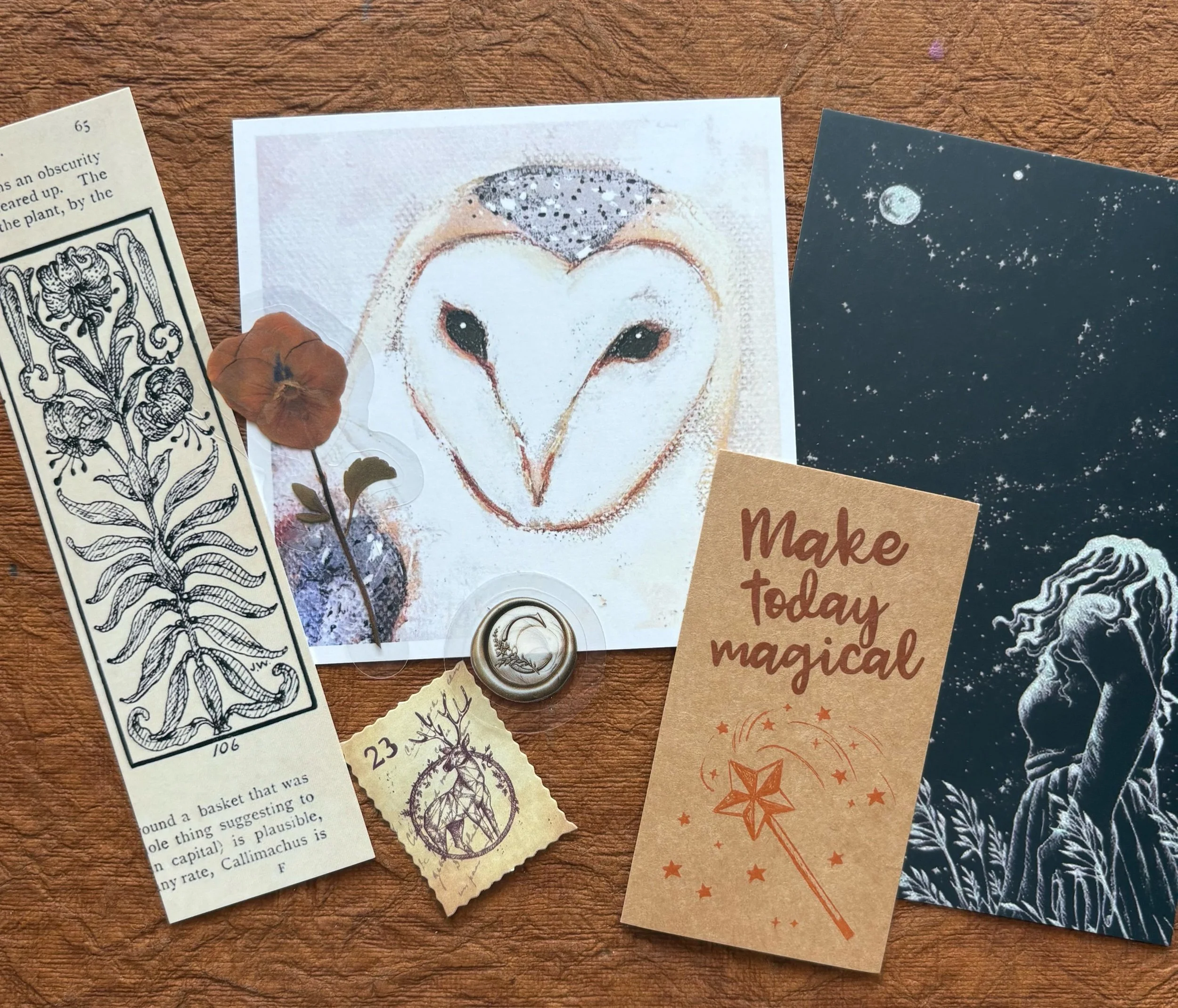 These goody bundles come with one 4x4” Signed print, a postcard, a bookmark, three stickers, and an inspirational quote card.